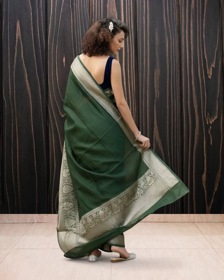 The Basil Green Pure Linen Banarasi Saree is a graceful ode to heritage craftsmanship and natural elegance. Handwoven on traditional looms in Banaras using 100% pure linen yarns, this saree reflects the finesse of time-honored Banarasi weaving techniques. Delicate golden zari motifs are meticulously embedded into the linen base, creating a perfect balance of subtle richness and breathable comfort. With its soft texture and fluid drape, itβs an ideal choice for both festive occasions and refined daily wear.