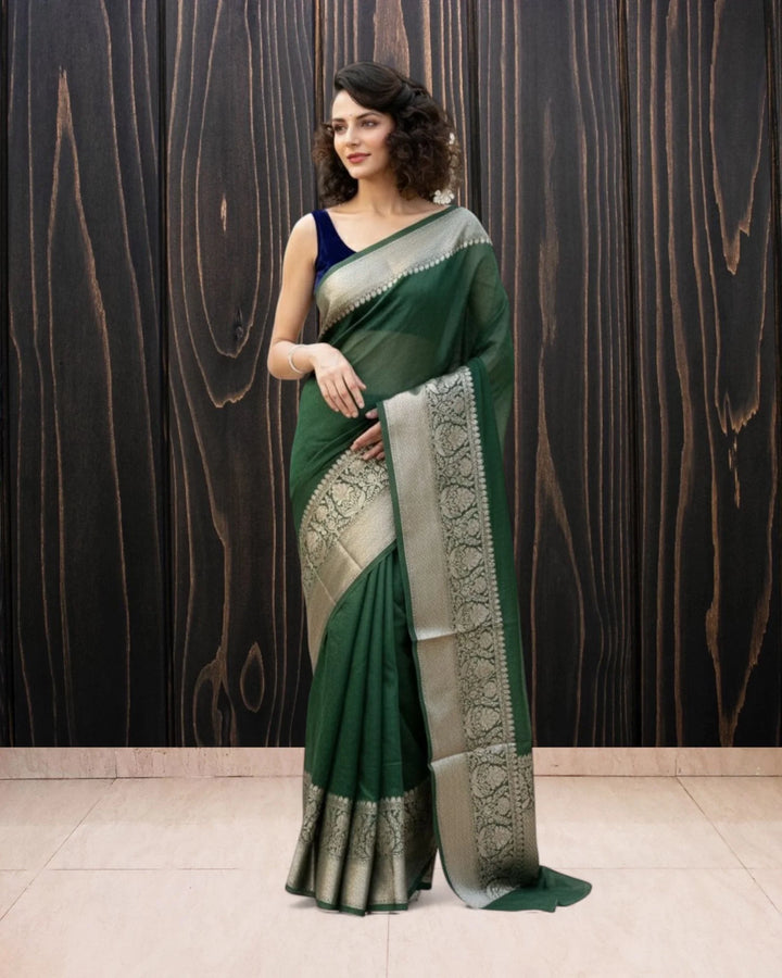 A calming and earthy basil green, inspired by natureβs tranquility and freshness. This serene green tone evokes harmony and poise, making it ideal for daytime functions, temple visits, or eco-conscious celebrations. The golden zari adds warmth and radiance, elevating the subtle green with traditional elegance. Under natural light, the basil hue softly glowsβoffering a look that is both rooted and refined.