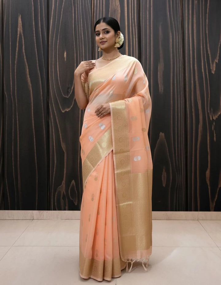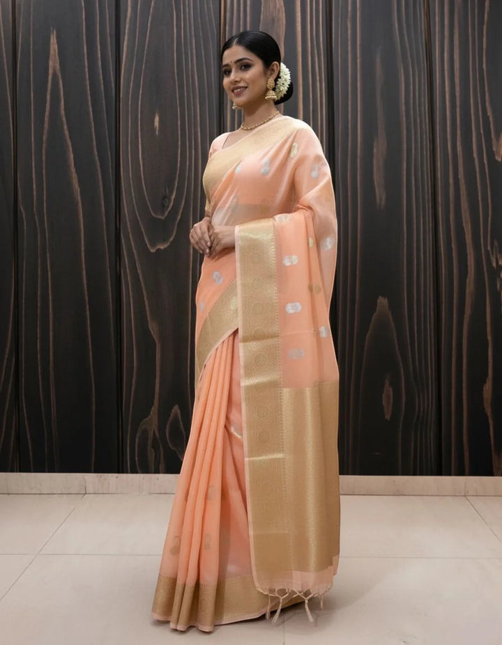 Crafted from Sona Pura PureΒ Kora (organza) silk, this exquisite handloom Banarasi saree is a testament to timeless craftsmanship. Woven using traditional techniques, it features intricate zari motifs and delicate meenakari work, lending it a light yet regal elegance. The sheer, lightweight fabric offers a graceful drape, perfect for both festive and formal occasions.